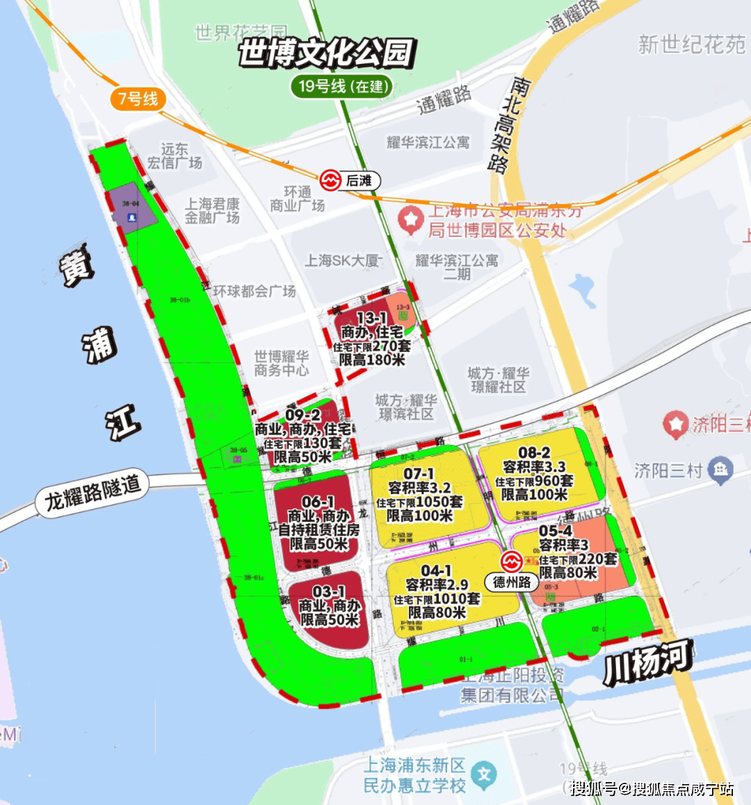 07-01地块是19号线德州路地铁口零距离的地块,而且距离旁边的幼儿园和预期规划九年制学校都很近,南侧过一个桥就是前滩,西侧250米左右就是滨江步道,北侧650米就是现有的7号线地铁口。