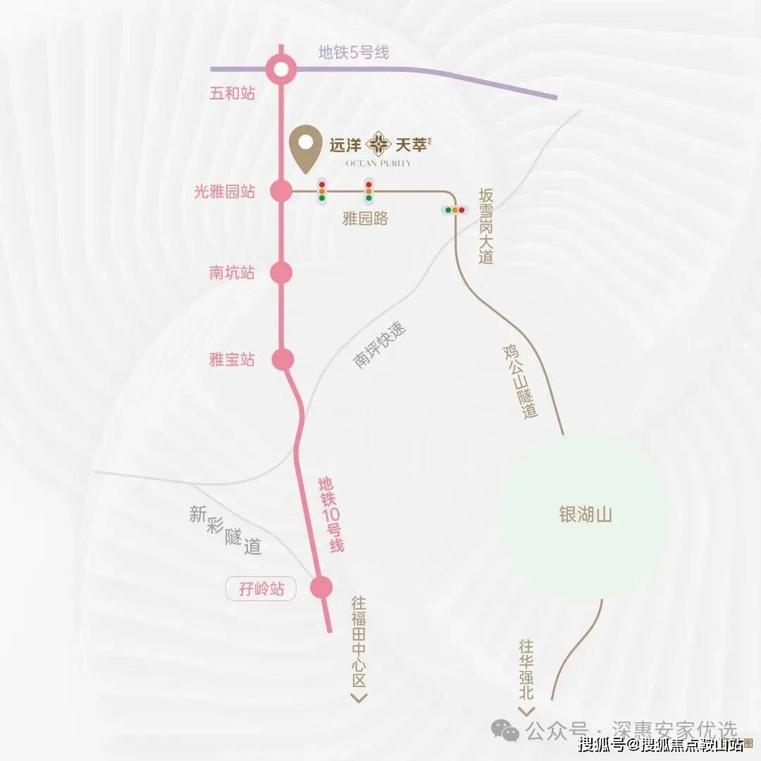 通勤效率,决定人生效率,纵向畅达坂雪岗、平湖、福田、罗湖;横向畅达南山、前海、坪山;雅园路直转坂雪岗大道。3个红绿灯到福田,10号线纵向串联坂雪岗、福田CBD;5号线横向串联蛇口、前海、西丽、布吉;电梯下楼无缝进站,3站到福田,1站到五和。