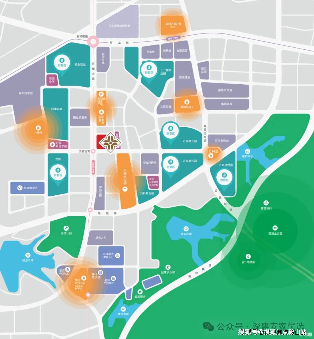 五和枢纽,1站距离刚刚好,1站路,便捷通达大湾区;1站路,近享超级枢纽商圈;约900米,避开百万级人潮喧嚣。