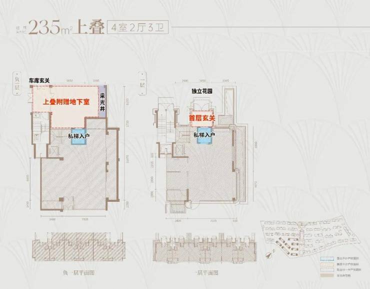 下叠户型地下单层面积约120㎡,层高达约6.3米,可以做双层使用,增加夹层后,地下空间可拓展至超200㎡,丰富的灵动空间足以满足业主的各类喜好!