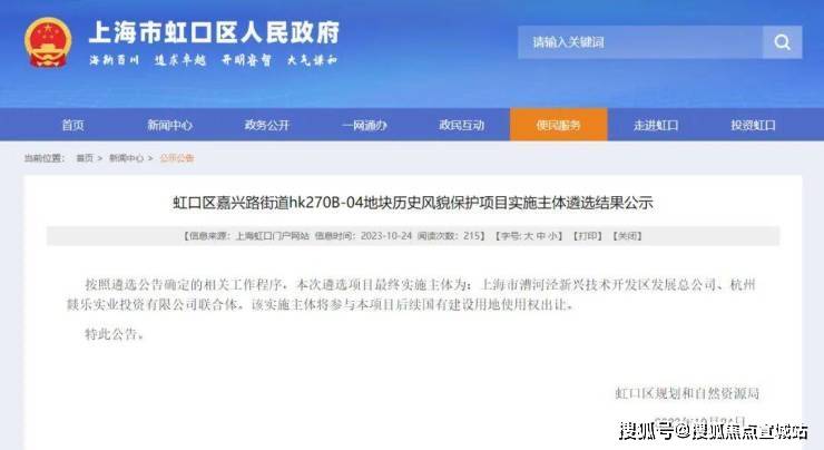 虹口区嘉兴路街道hk270B-04地块历史风貌保护项目实施主体遴选结果公示,终确定由上海市漕河泾新兴技术开发区发展总公司(临港集团)及杭州燚乐实业投资有限公司(越秀)联合开发。