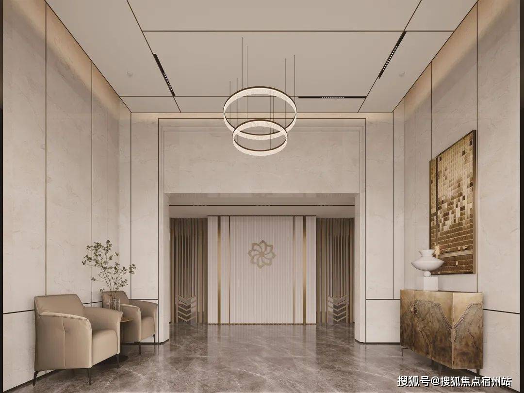 品质感拉满。首层入户大堂,石材搭配金属装饰条的地面、墙面,空间宽敞气派,质感十足。